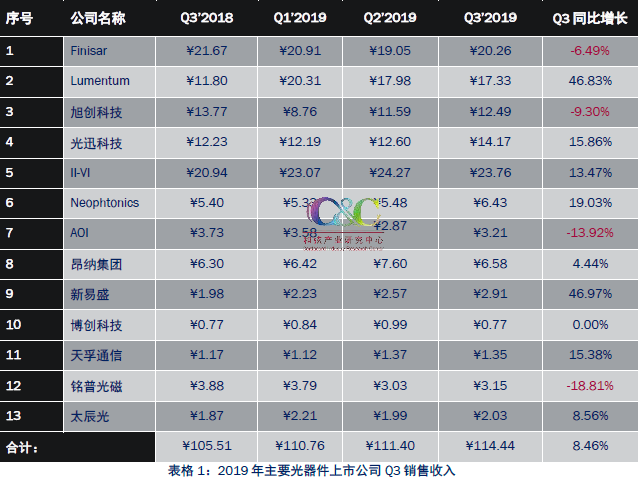專注于光通信領(lǐng)域市場(chǎng)研究公司和弦產(chǎn)業(yè)研究中心(簡(jiǎn)稱:C&C)近日發(fā)布2019年三季度光通信市場(chǎng)動(dòng)態(tài)報(bào)告。報(bào)告稱三季度光器件受益于5G需求效應(yīng)、云計(jì)算市場(chǎng)回暖、以及人民幣匯率等影響,市場(chǎng)規(guī)模無(wú)論是同比,還是環(huán)比均呈現(xiàn)微增態(tài)勢(shì)。